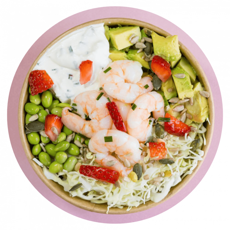 Crevettes marinées, avocat, chou rouge, edamame, creamcheese citronnée, sweet mayo, ananas et sésame grillé