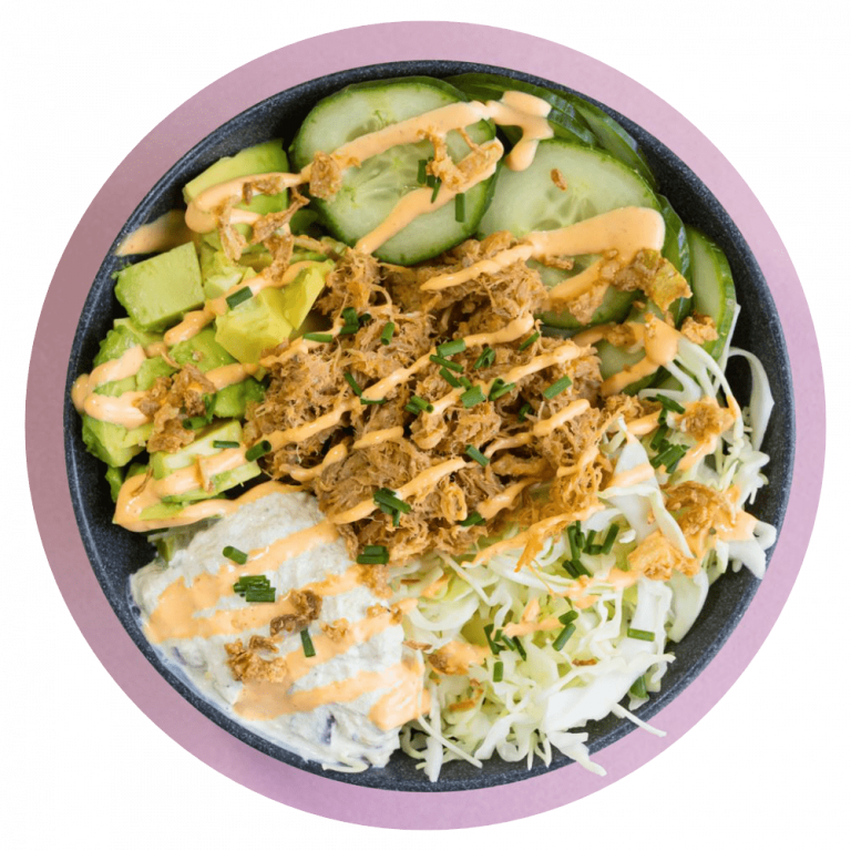 Effiloché de porc français, avocat, chou rouge,  concombre, creamcheese thon, spicy mayo, oignons frits, ciboulette