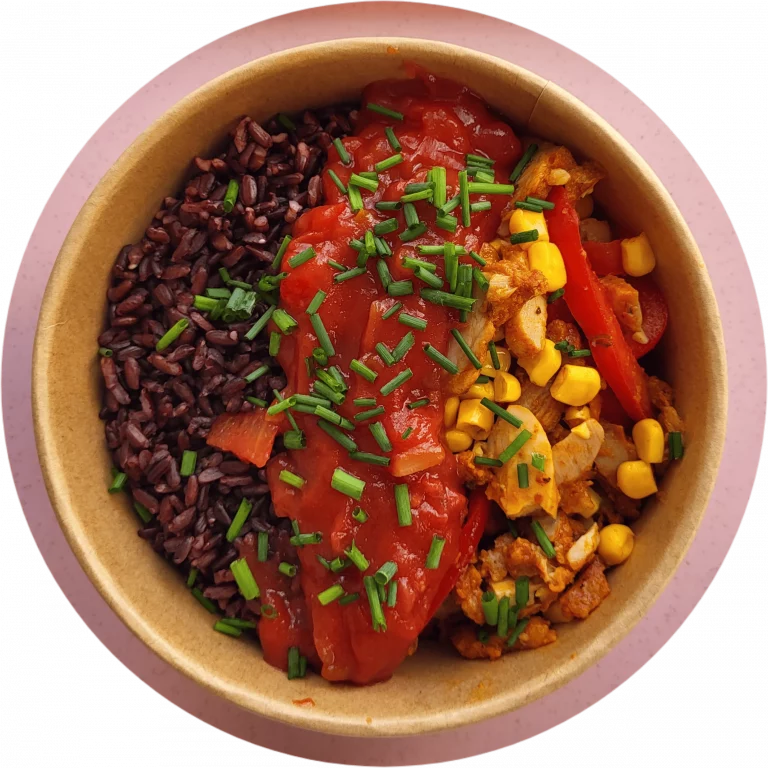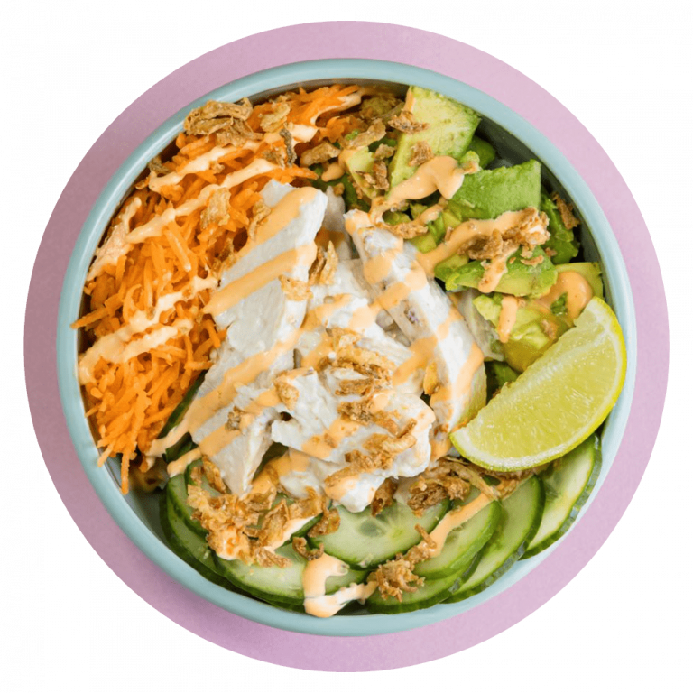 Mini poké au poulet Français, carotte, avocat, mangue.