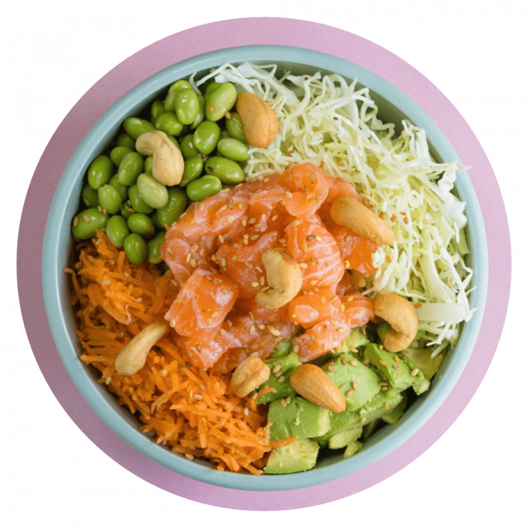 Saumon, gingembre mariné, avocat, chou rouge, edamame, carotte, sésame grillé, sauce poké et spicy mayo