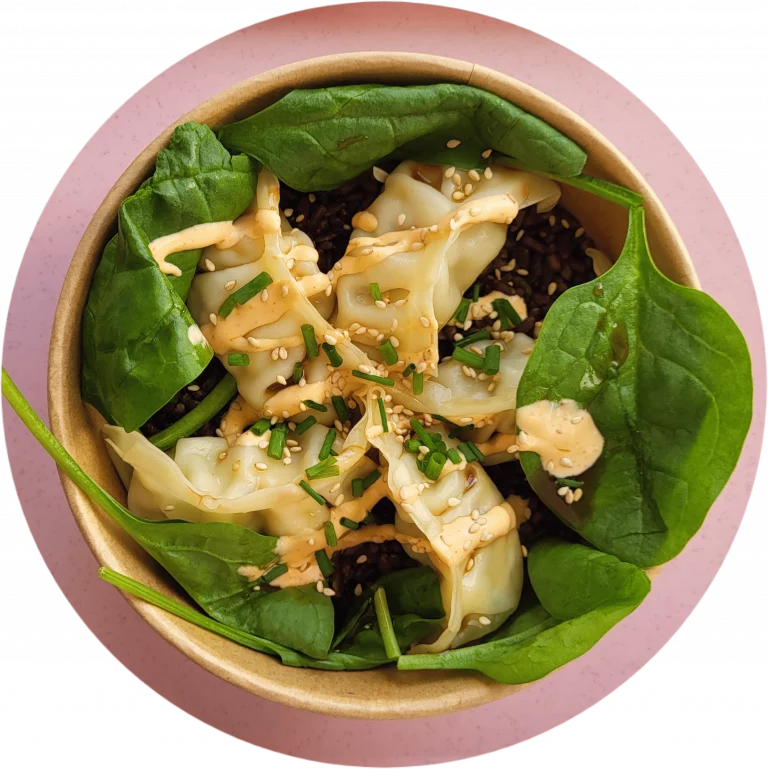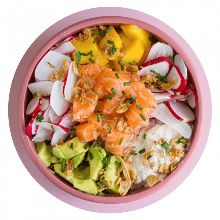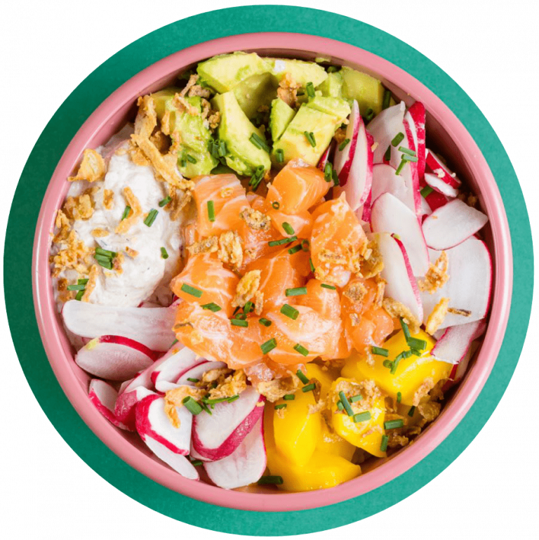 Saumon, avocat, mangue, pousses d’épinard, creamcheese au thon, sauce poké, oignons frits, ciboulette