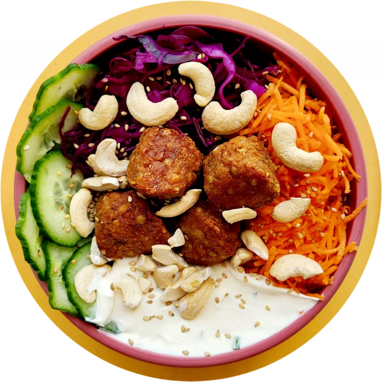 Boulettes d’orge au chèvre et miel, creamcheese citronnée, chou rouge, carotte, concombre, sauce poké, noix de cajou, sésame grillé