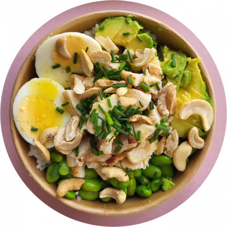 Œuf, poulet français, avocat, edamame, vinaigrette, citronnée, ciboulette, noix de cajou